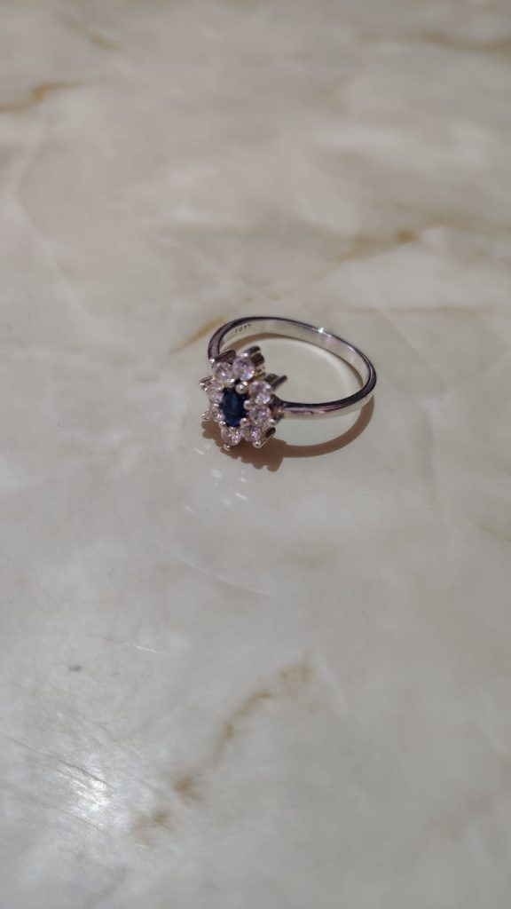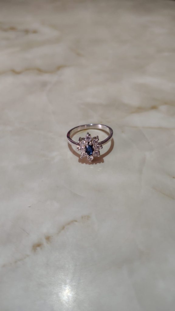 Este delicado anillo está elaborado en plata 925 y protagonizado por un circón Zafiro de corte oval. Su diseño se complementa con pequeños circones blancos que rodean la piedra central, aportando brillo y un acabado sofisticado.
