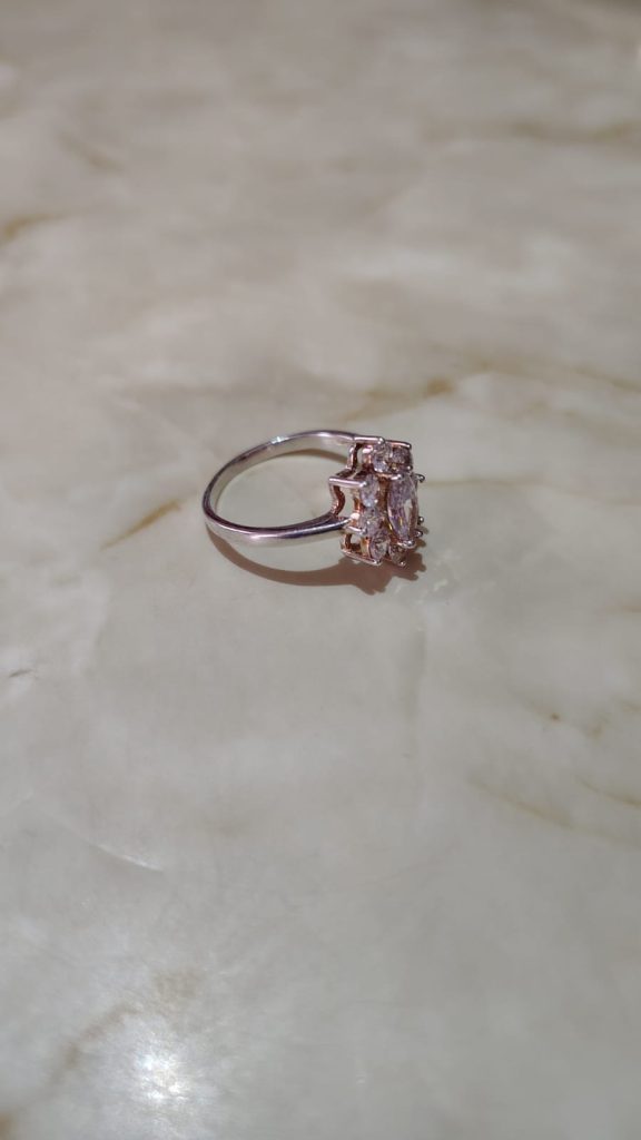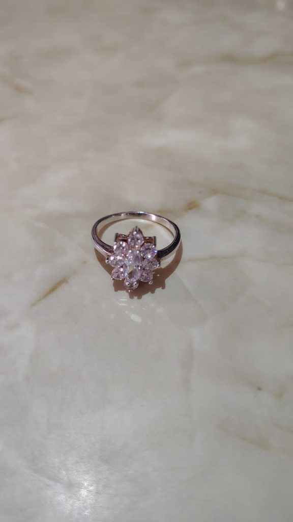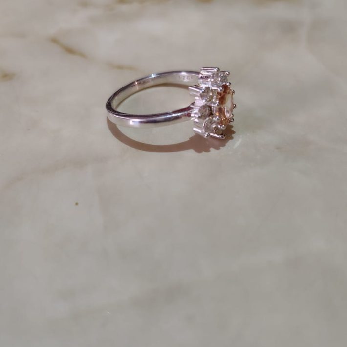 Este delicado anillo está elaborado en plata 925 y protagonizado por un circón blanco de corte oval. Su diseño se complementa con pequeños circones blancos que rodean la piedra central, aportando brillo y un acabado sofisticado.