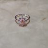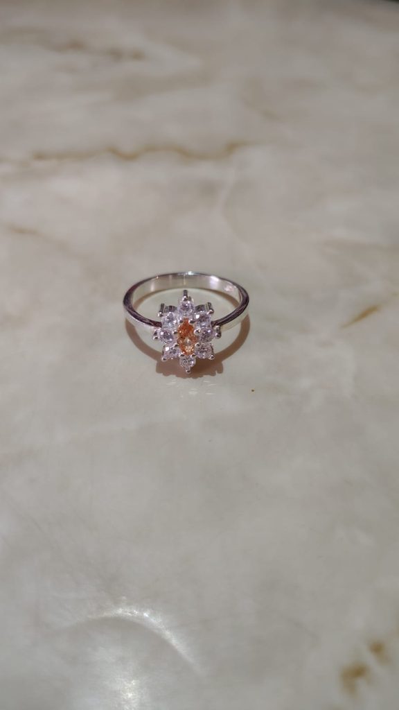 Presenta una piedra central ovalada topacio naranja  rodeada de circonitas  más pequeños de color blanco.