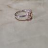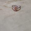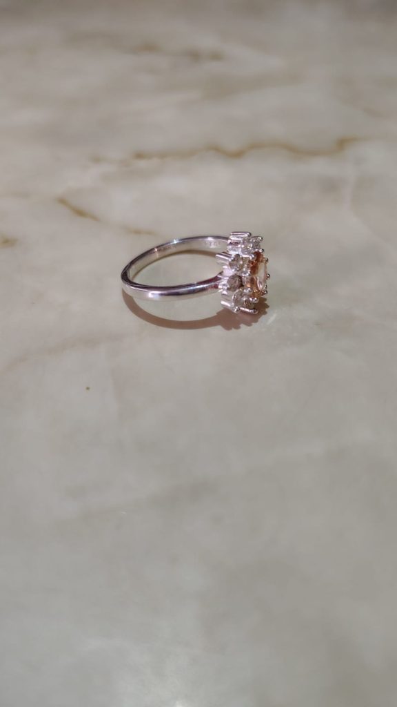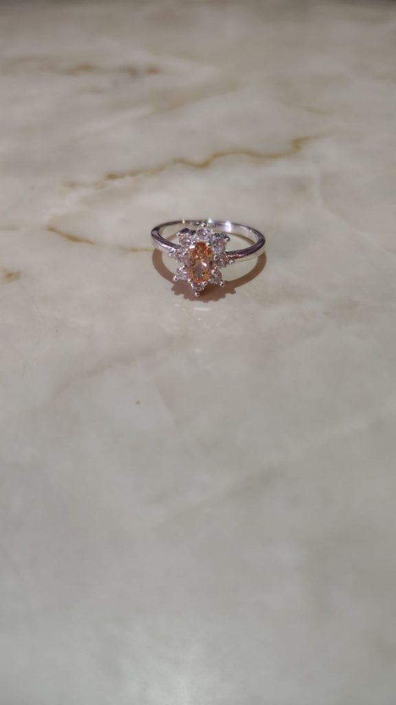 Anillo de racimo floral Presenta una piedra central ovalada de color naranja rodeada de circonitas más pequeños de color blanco.