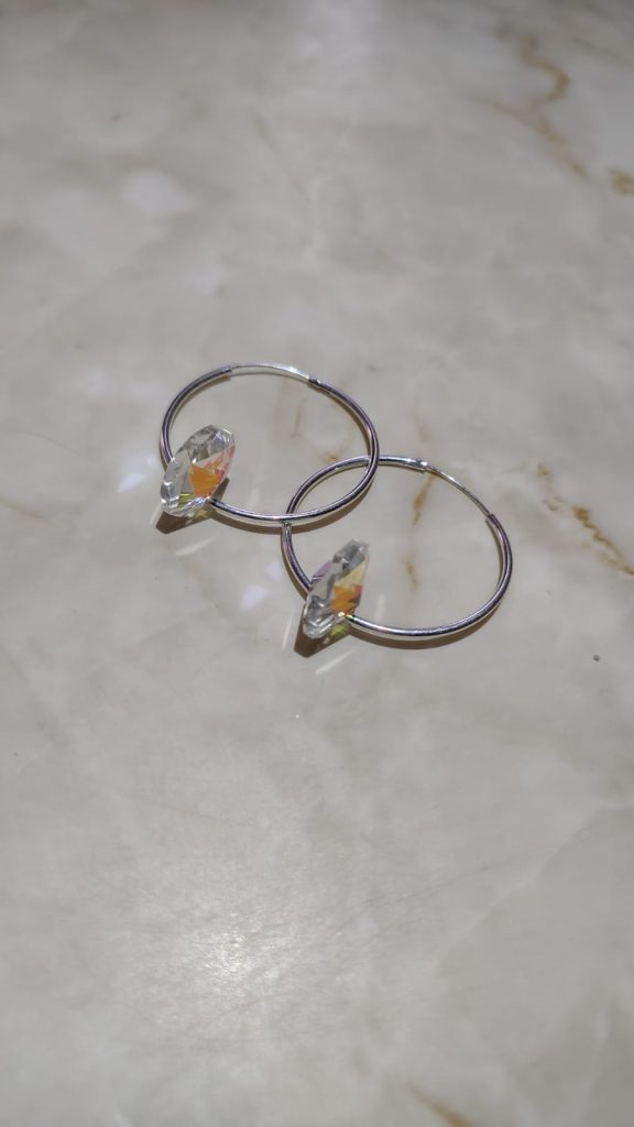Se trata de aros de argolla de plata con un colgante de cristal iridiscente, comúnmente conocido como cristal «Aurora Boreal». Estos aros combinan un diseño clásico de argolla con un toque de brillo distintivo.