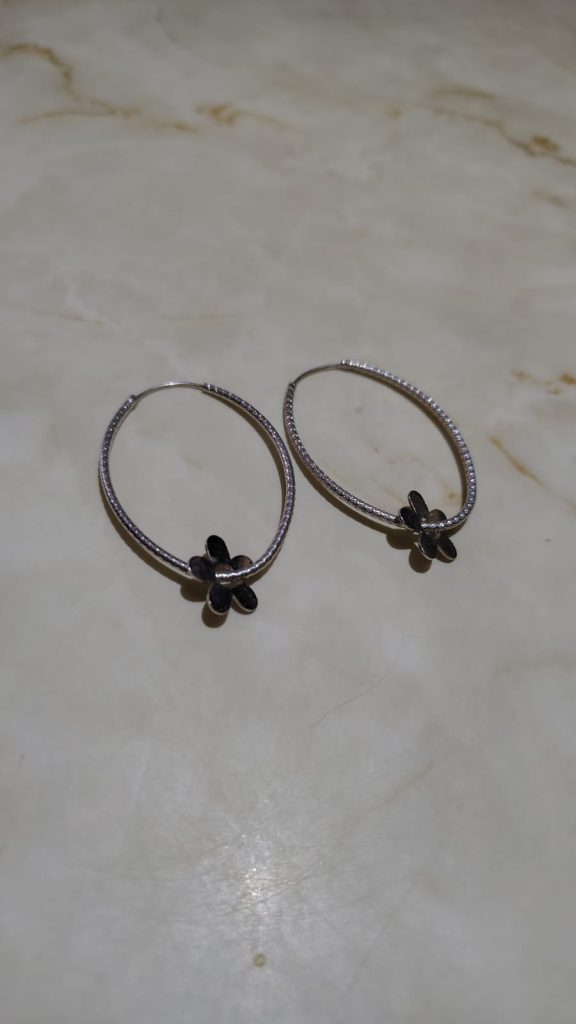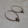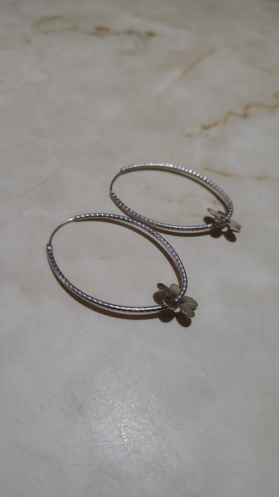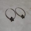 Estos aros tipo argolla de plata con un pequeño colgante en forma de flor. Textura facetada o enroscada de forma ovalada.