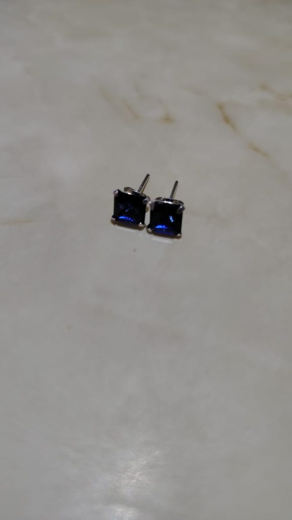 Estos pendientes de botón cuadrados con una piedra central de color azul intenso, circón zafiro , engastada en plata . El corte de la piedra es de tipo princesa, lo que les otorga un aspecto elegante y clásico.