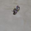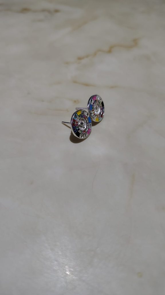 Estos son pendientes de botón circulares con esmalte de colores y circonitas. Cuentan con un diseño distintivo que incorpora pequeñas letras o símbolos y segmentos de colores vivos. «pendientes de protección/amuleto»