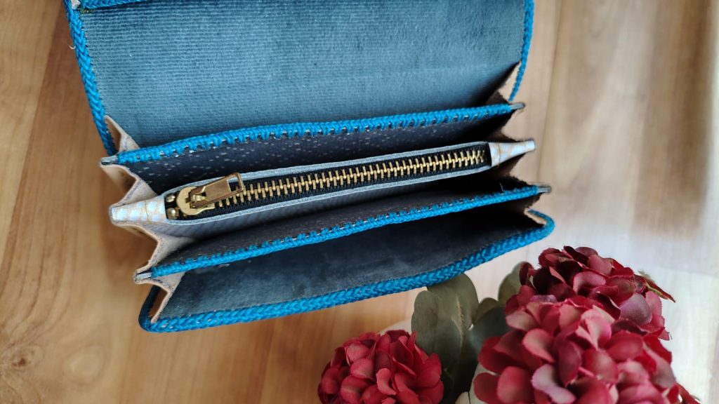 Billetera de cuero color beige, cocida con hilo perlón turquesa, caracterizándose por su alta durabilidad y calidad en el producto, lo cual encarna nuestro compromiso como empresa.