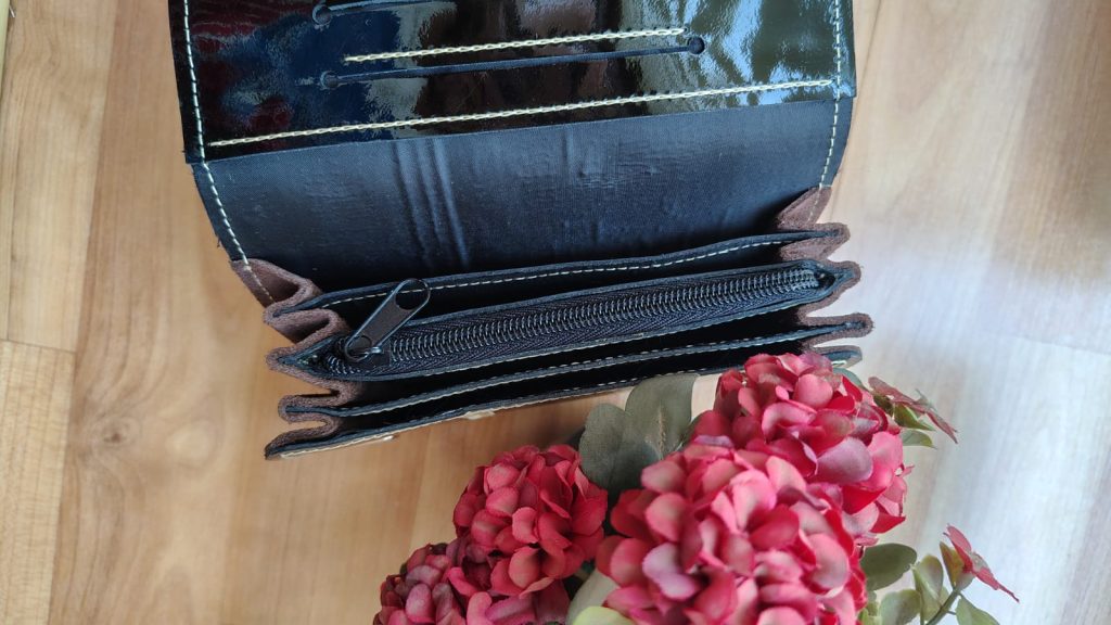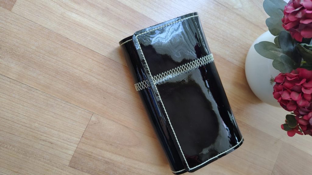 Billetera de cuero charol negro, elegante y única. Esta se caracteriza por su alta durabilidad y calidad en el producto.