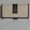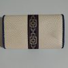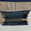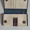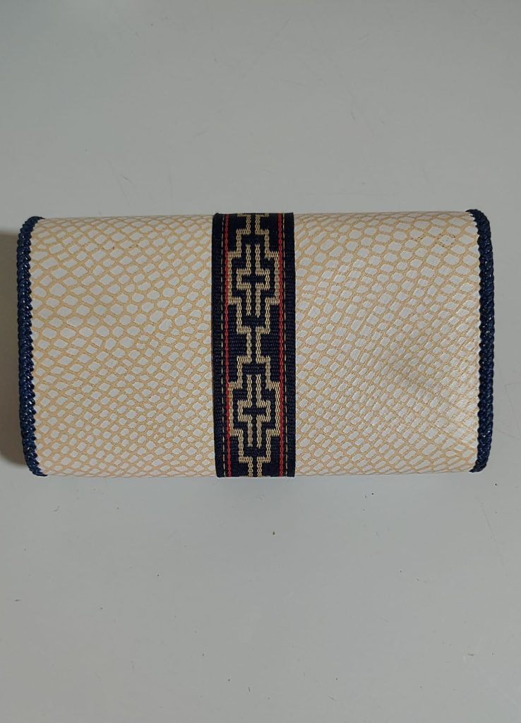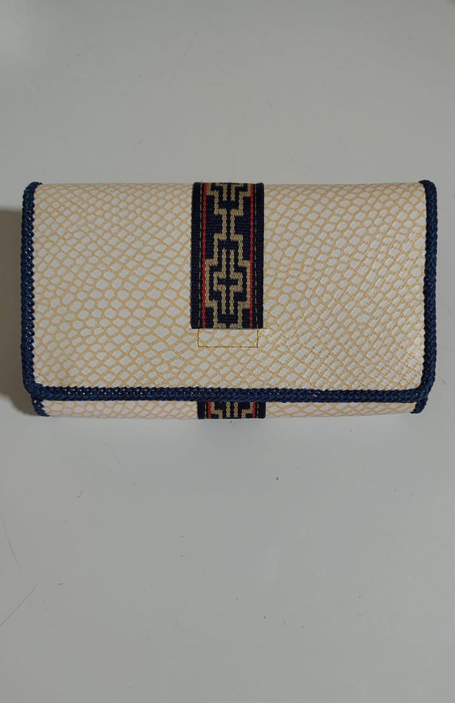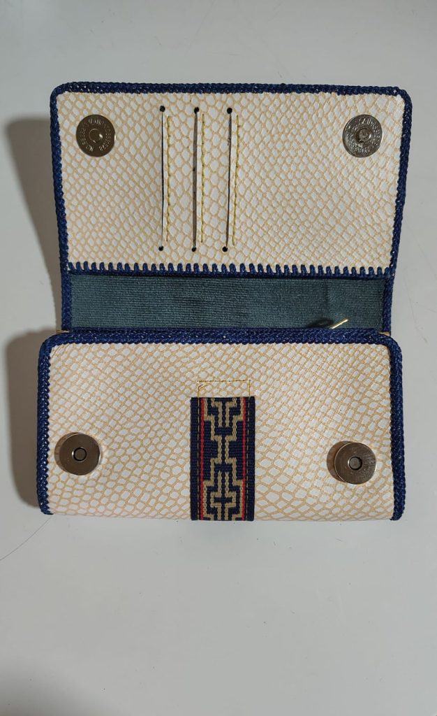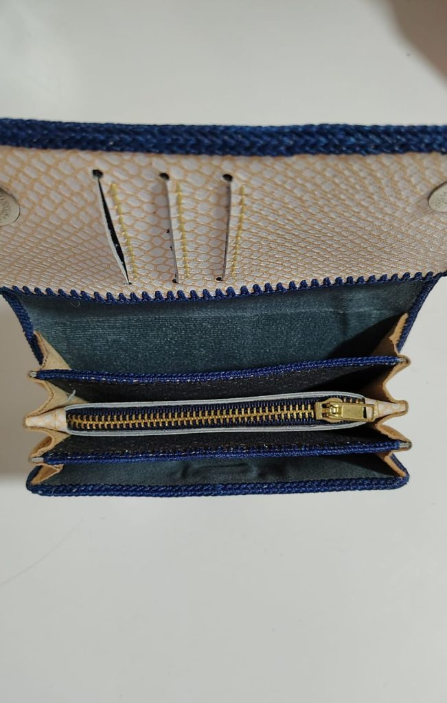 Billetera de cuero color beige, cocida con hilo perlón azul adornada con una cinta azul oscuro estilo rombo con costura cuyana, hecha a mano. Destaca por ser espaciosa, tiene compartimientos para almacenar cada una de sus necesidades, caracterizándose por su alta durabilidad y calidad en el producto, lo cual encarna nuestro compromiso como empresa.