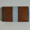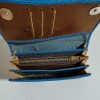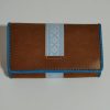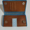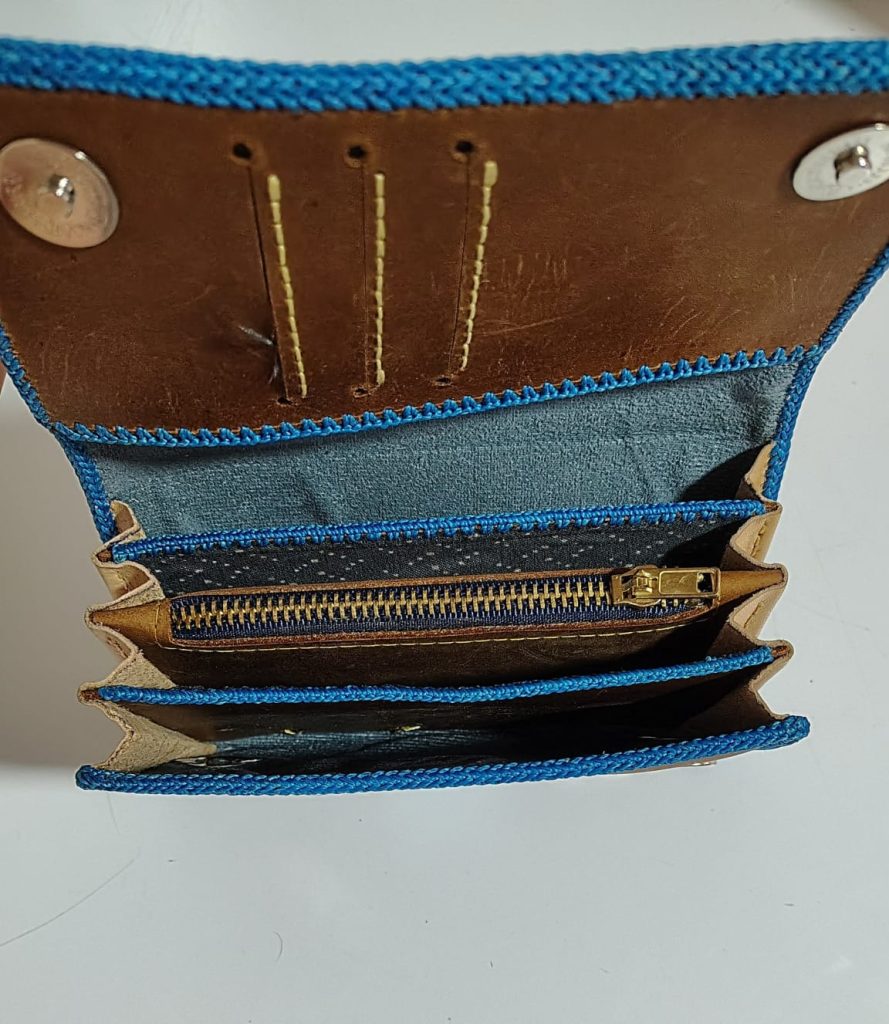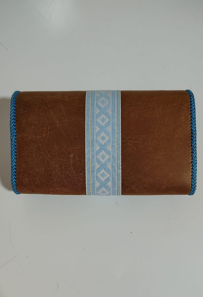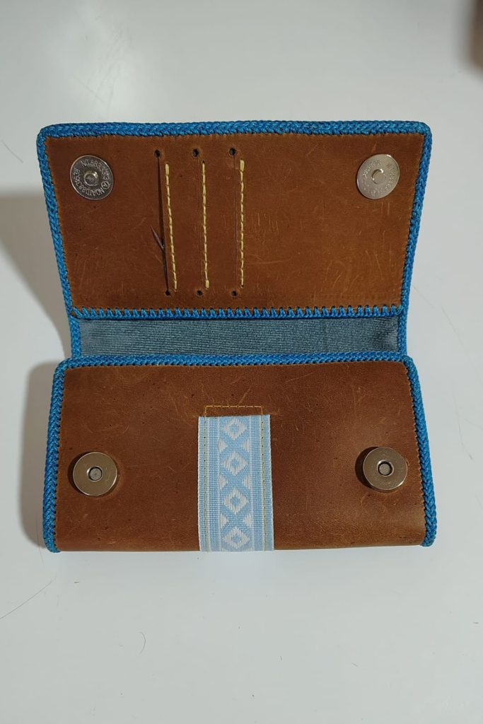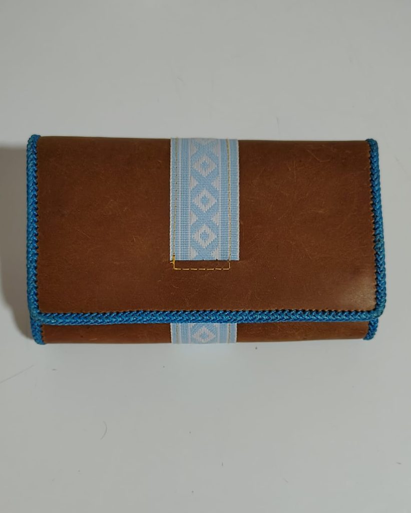Billetera de cuero color café, cocida con hilo perlón azul adornada con una cinta celeste con blanco estilo rombo con costura cuyana, hecha a mano. Destaca por ser espaciosa, tiene compartimientos para almacenar cada una de sus necesidades, caracterizándose por su alta durabilidad y calidad en el producto, lo cual encarna nuestro compromiso como empresa.