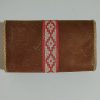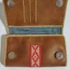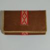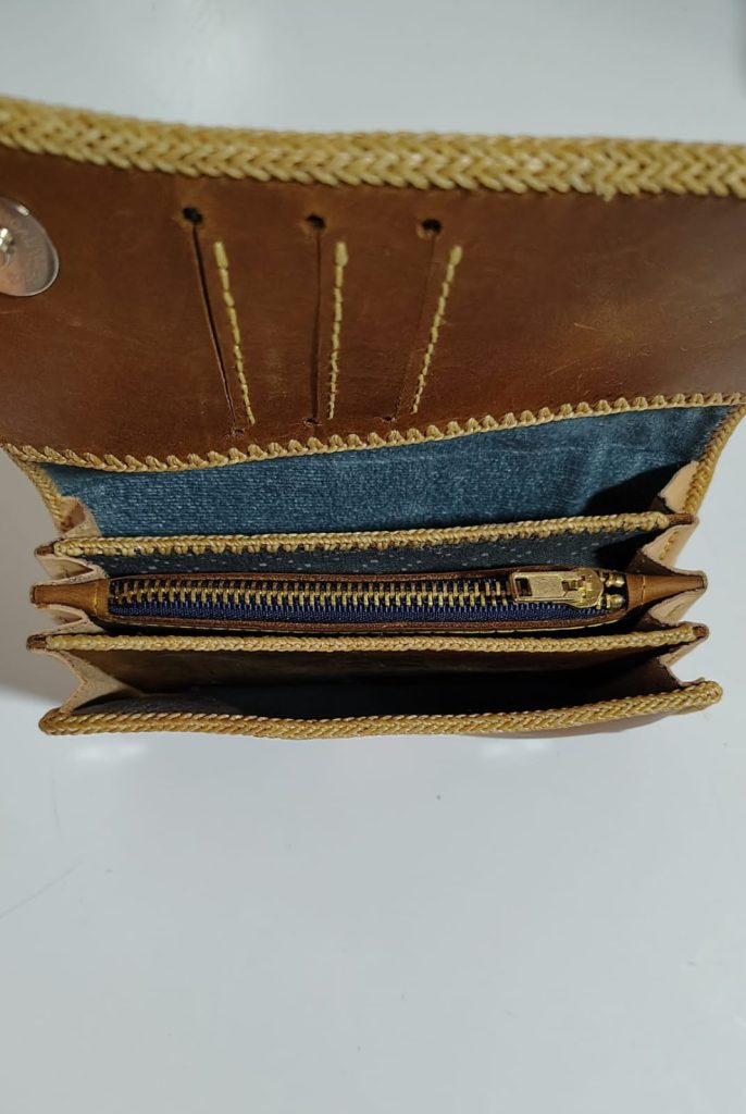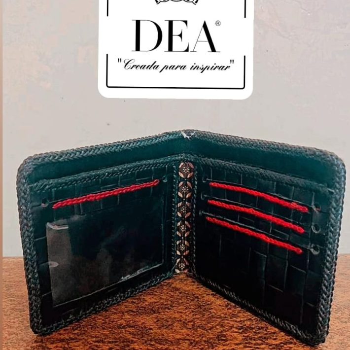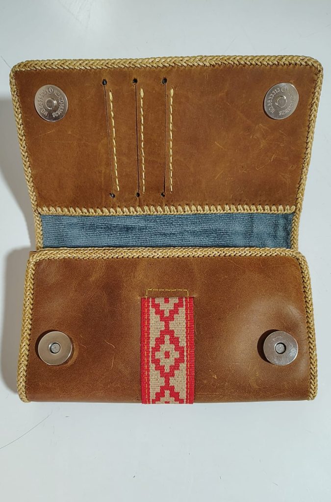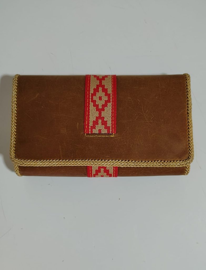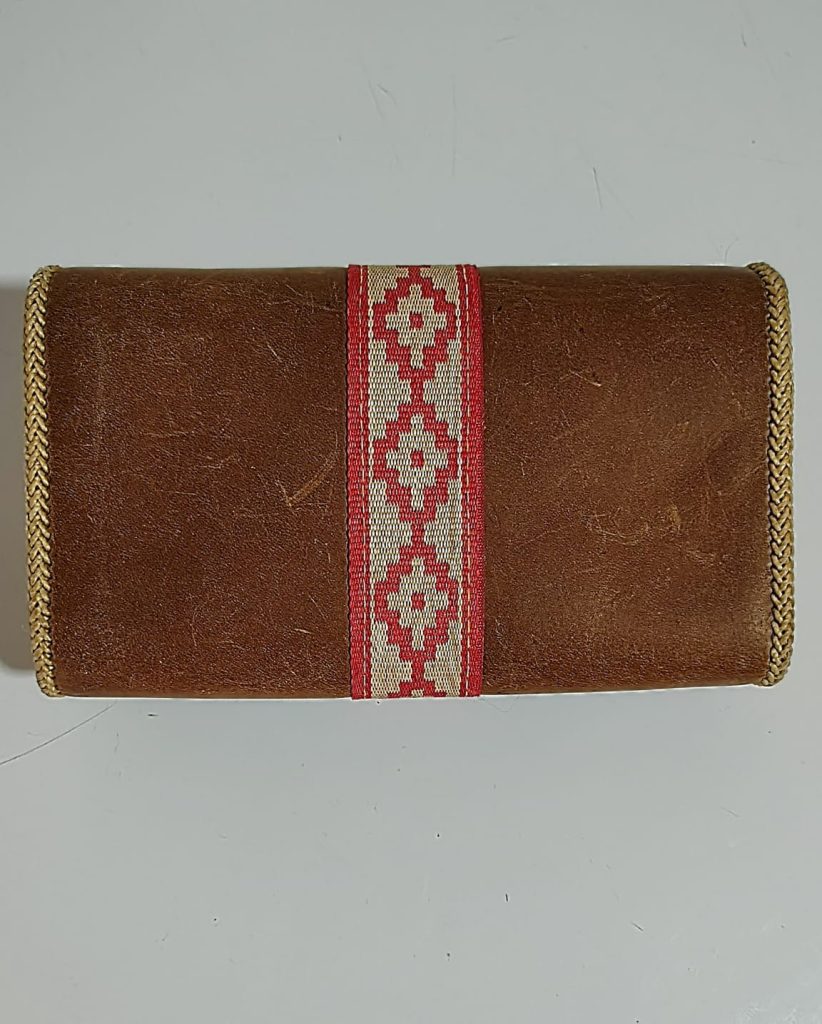 Billetera de cuero color café, cocida con hilo perlón café claro adornada con una cinta roja estilo rombo con costura cuyana, hecha a mano. Destaca por ser espaciosa, tiene compartimientos para almacenar cada una de sus necesidades, caracterizándose por su alta durabilidad y calidad en el producto, lo cual encarna nuestro compromiso como empresa.