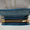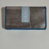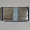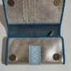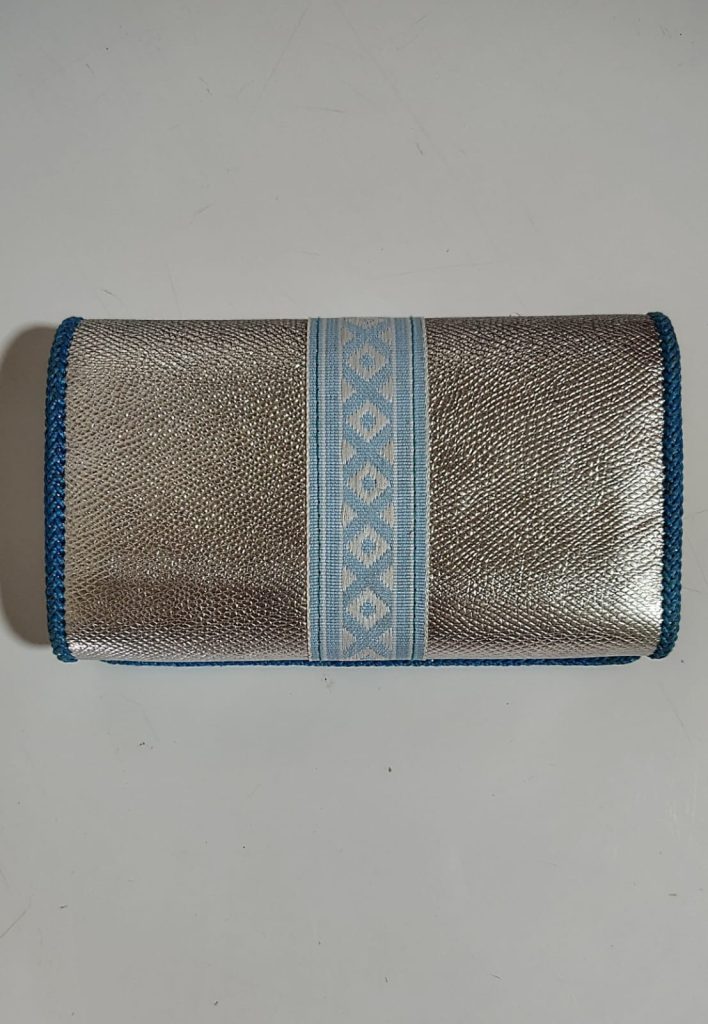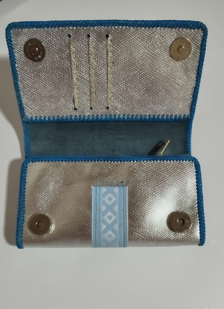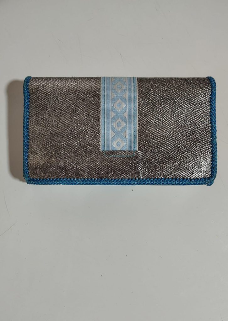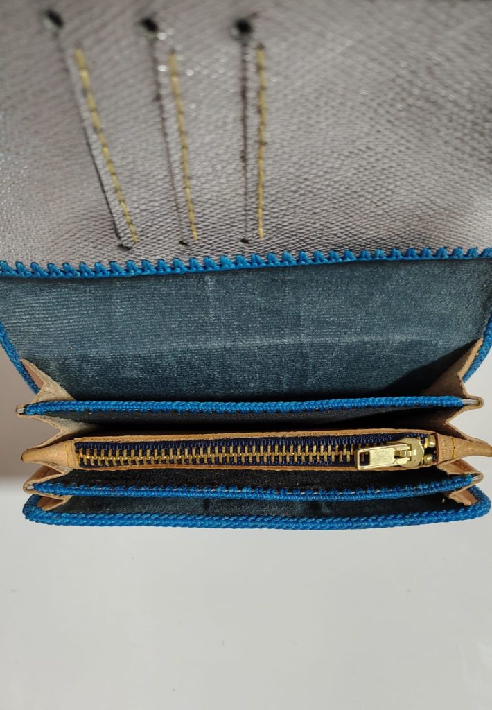 Billetera de cuero color plateada, cocida con hilo perlón de color celeste costura cuyana realizada a mano. Destaca por ser espaciosa, tiene compartimientos para almacenar cada una de sus necesidades, caracterizándose por su alta durabilidad y calidad en el producto, lo cual encarna nuestro compromiso como empresa.