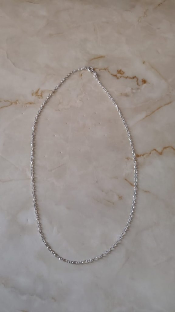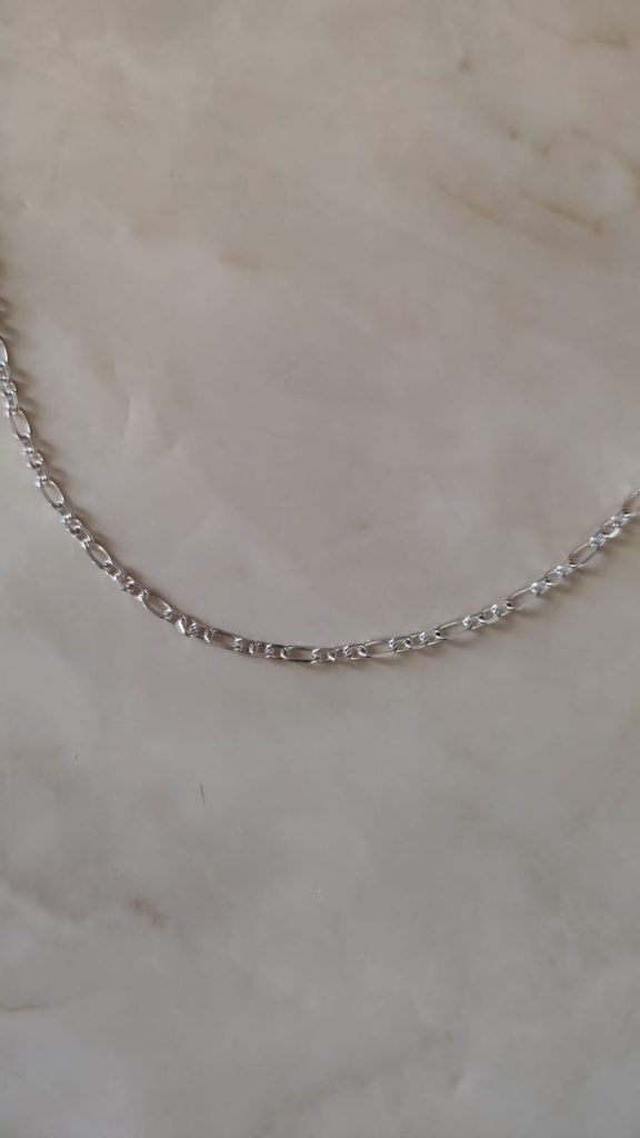 Cadena de eslabones tipo Fígaro de plata. Este diseño se caracteriza por un patrón distintivo de varios eslabones circulares pequeños seguidos de un eslabón ovalado alargado.