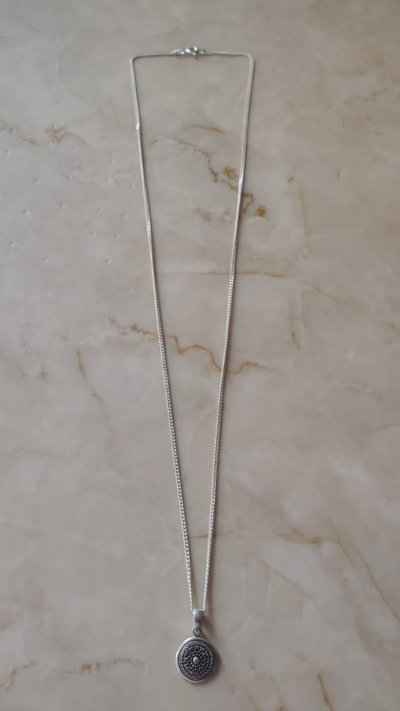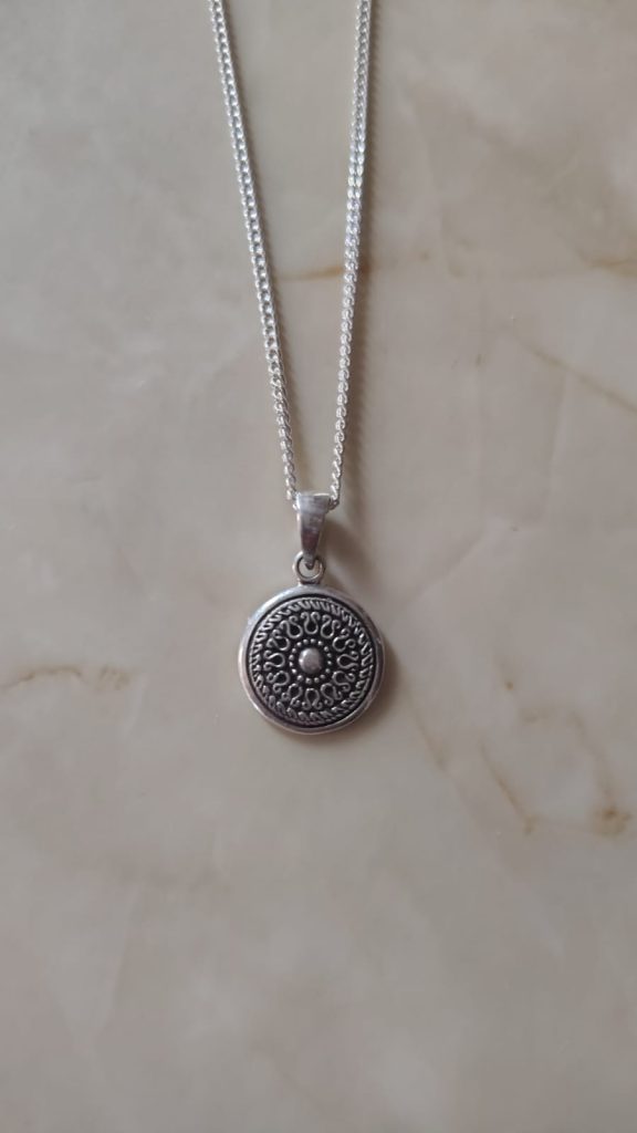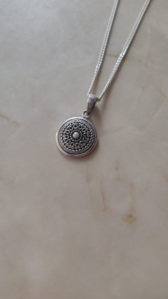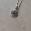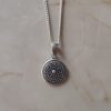 Colgante circular con diseño de mándala. El colgante presenta un diseño intrincado y detallado que se asemeja a un símbolo espiritual.
