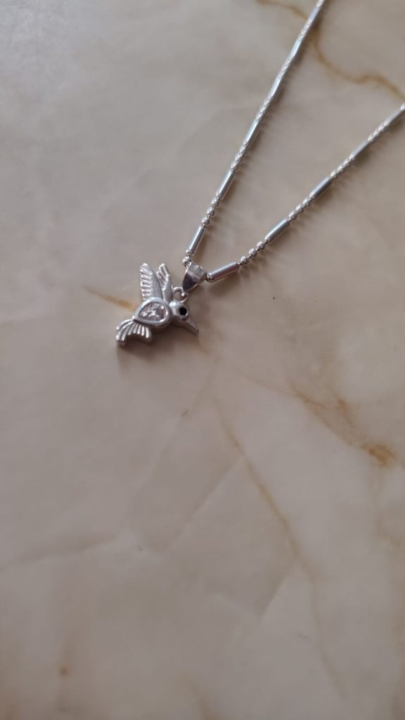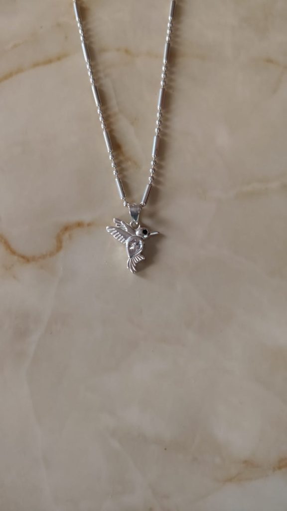 El colgante tiene la forma de un colibrí en pleno vuelo, con un pequeño circón para darle brillo.