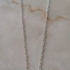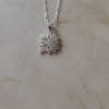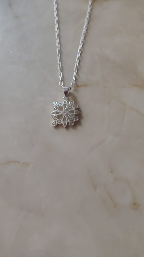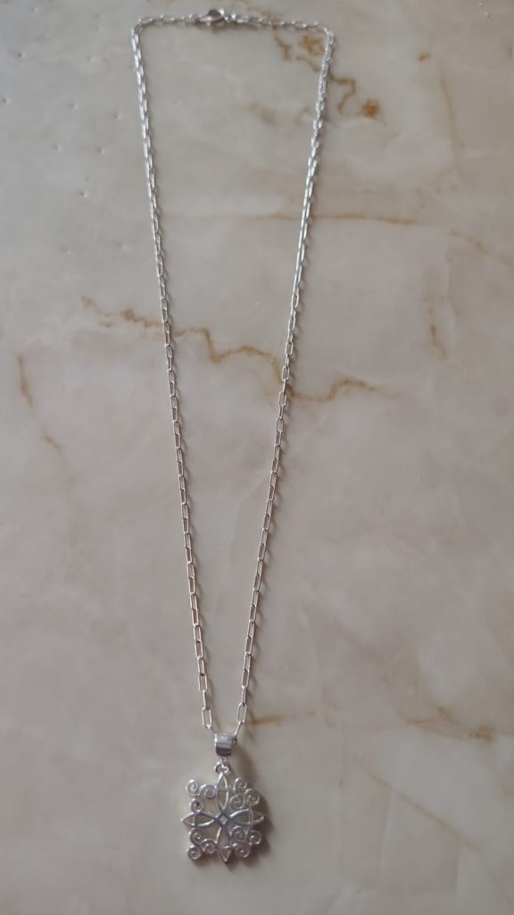 Este es un colgante de plata con forma estilizada de un copo de nieve. La cadena es de eslabones tipo cable alargados y el colgante presenta un diseño intrincado y simétrico de filigrana.