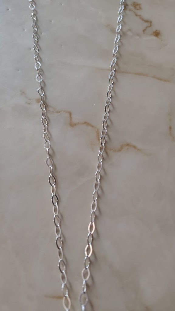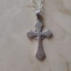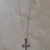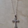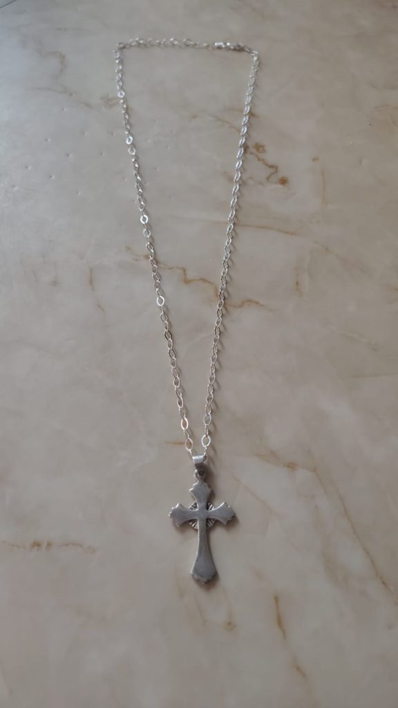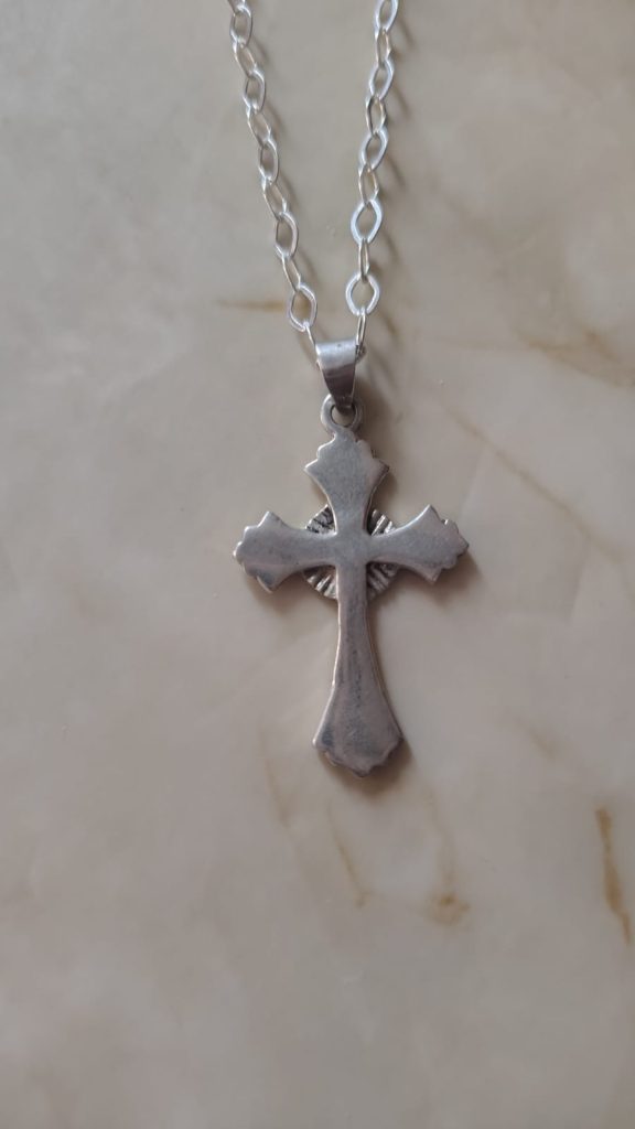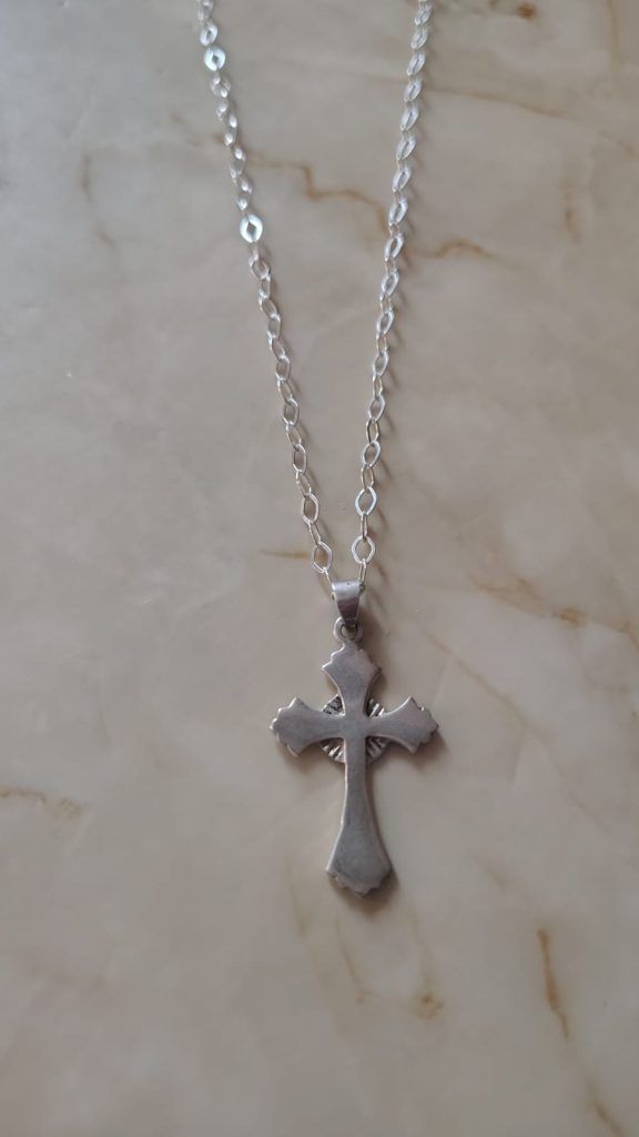 Este colgante tiene un diseño de cruz floreada o «Budded cross», que es un estilo de cruz cuyos extremos terminan en formas de trébol, y está colgado de una cadena de eslabones ovalados.