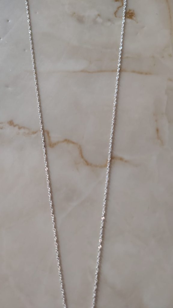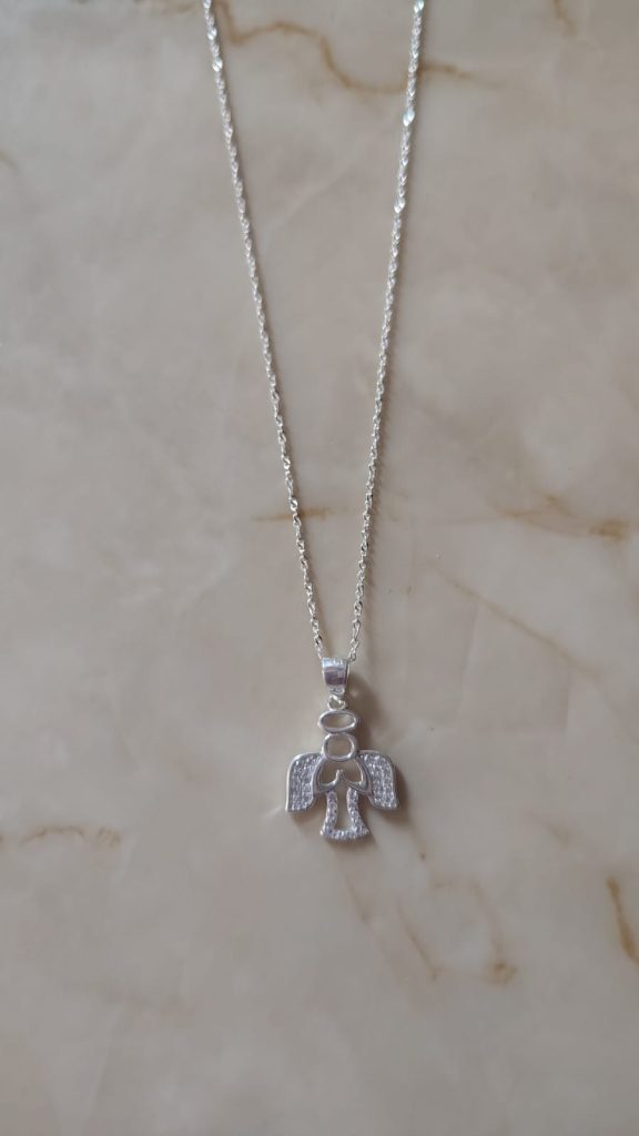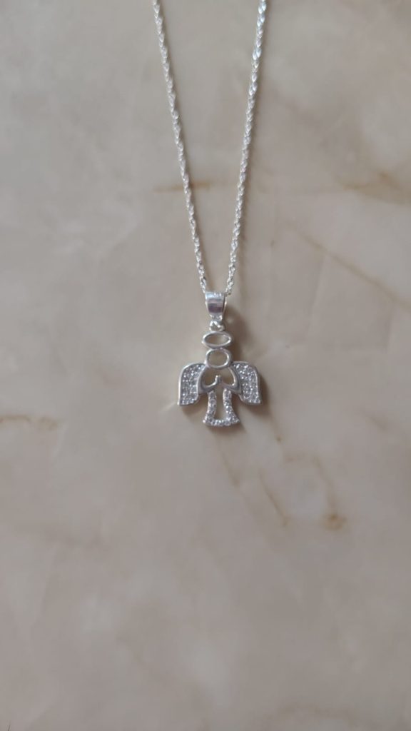 Colgante con dije de ángel, simboliza protección y guía espiritual.