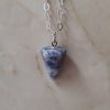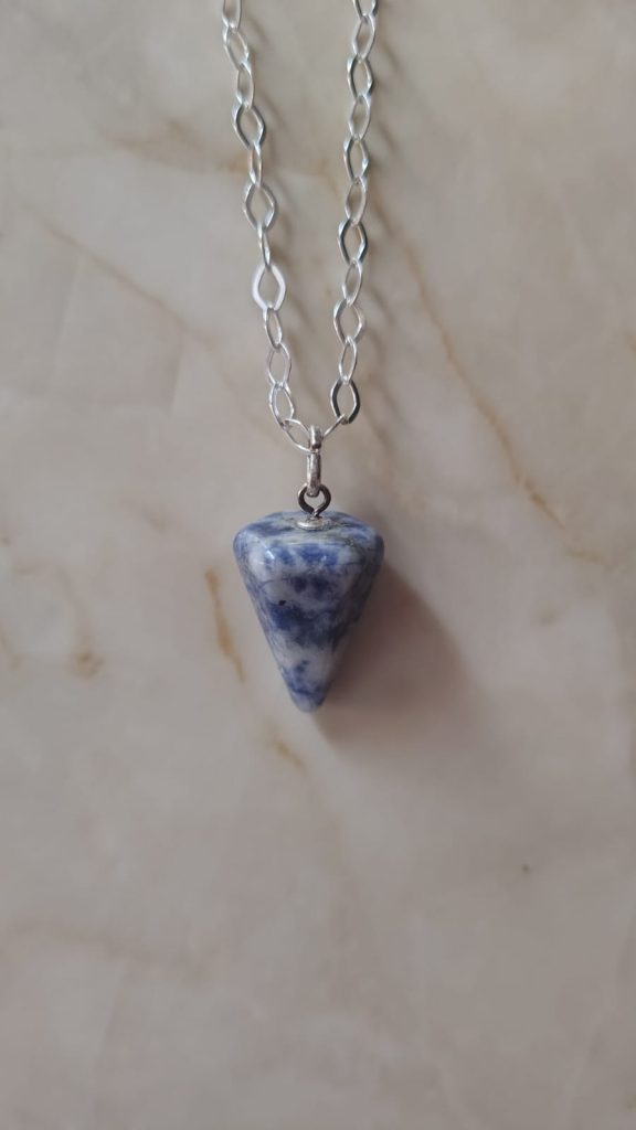 Colgante de sodalita azul en forma de péndulo. La sodalita es una piedra natural conocida por su color azul con vetas o manchas blancas. Cadena de eslabones de plata.