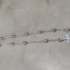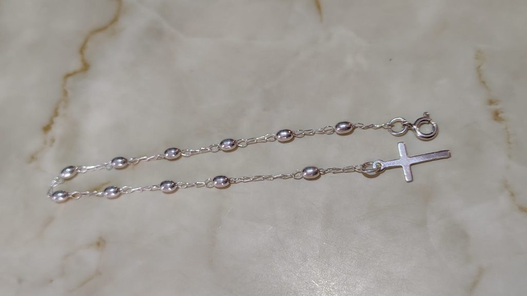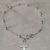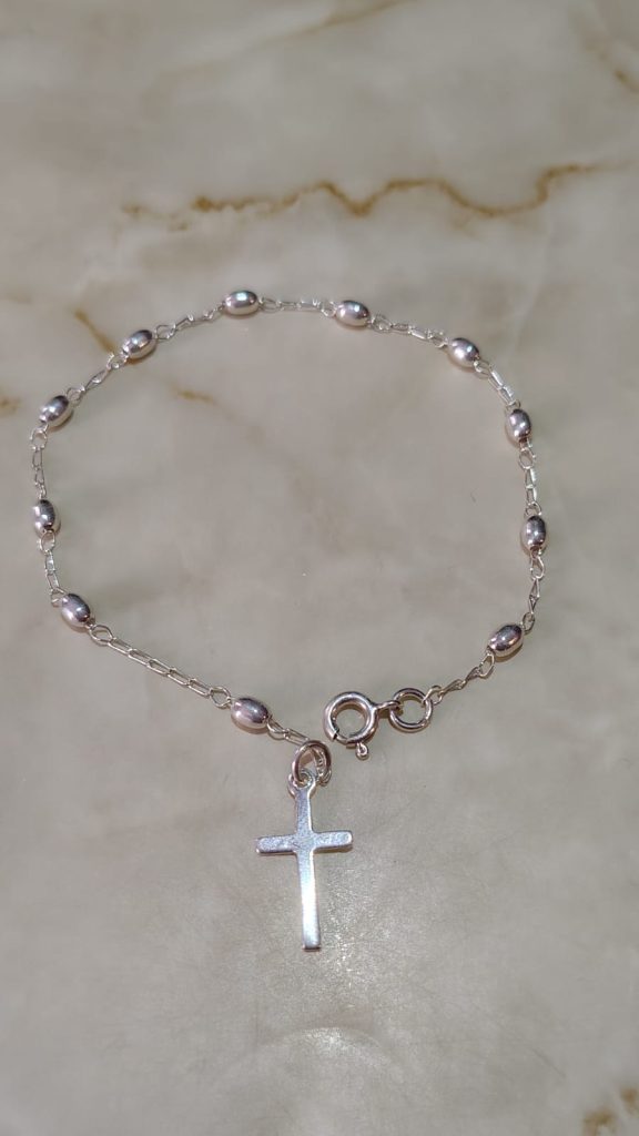 Diseño clásico y simple con cuentas esféricas y ovaladas alternas, una cadena fina y una pequeña cruz como colgante final.