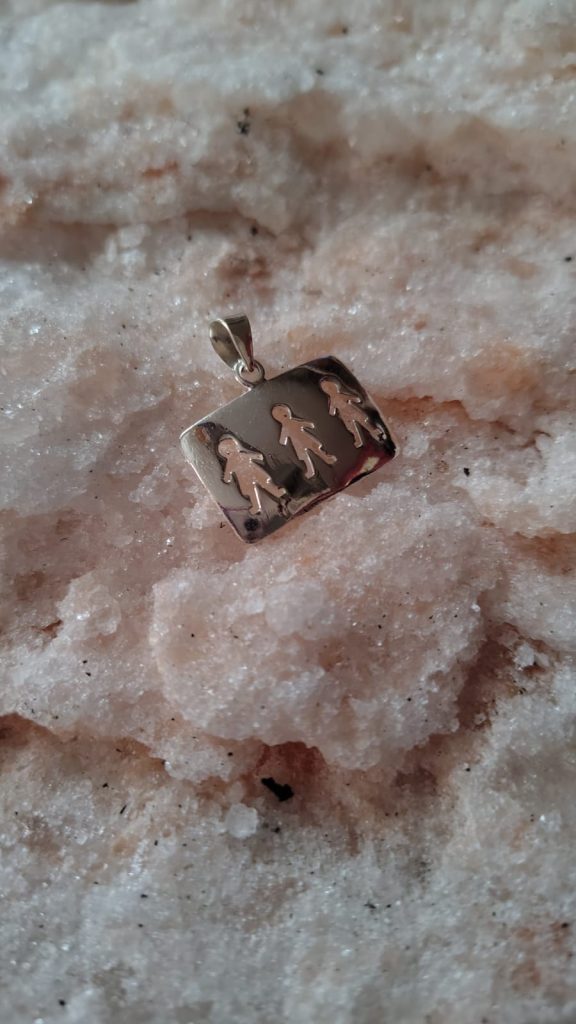 Dije de plata con tres figuras que representan niños o hijas, el diseño específico es una silueta de tres figuras tomadas de la mano, colgante para mamás, simbolizando a sus hijos o la familia.