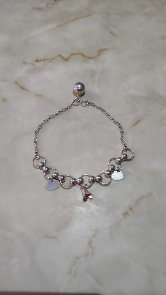 Esta pulsera cuenta con un diseño de cadena que incorpora secciones de pequeñas bolitas o cuentas de metal, lo que le da un aspecto moderno y versátil. Además cuenta con dije Copihue. Mide 17 cms.