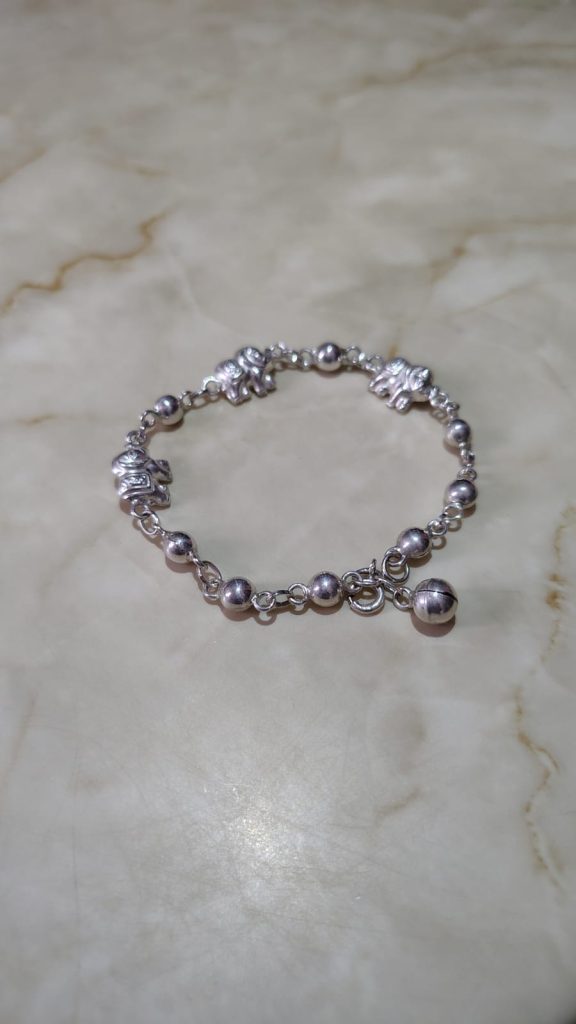 Esta pulsera combina una cadena de eslabones con cuentas esféricas intercaladas y varios dijes de elefante, además de un dije colgante tipo campana o esfera lisa.
