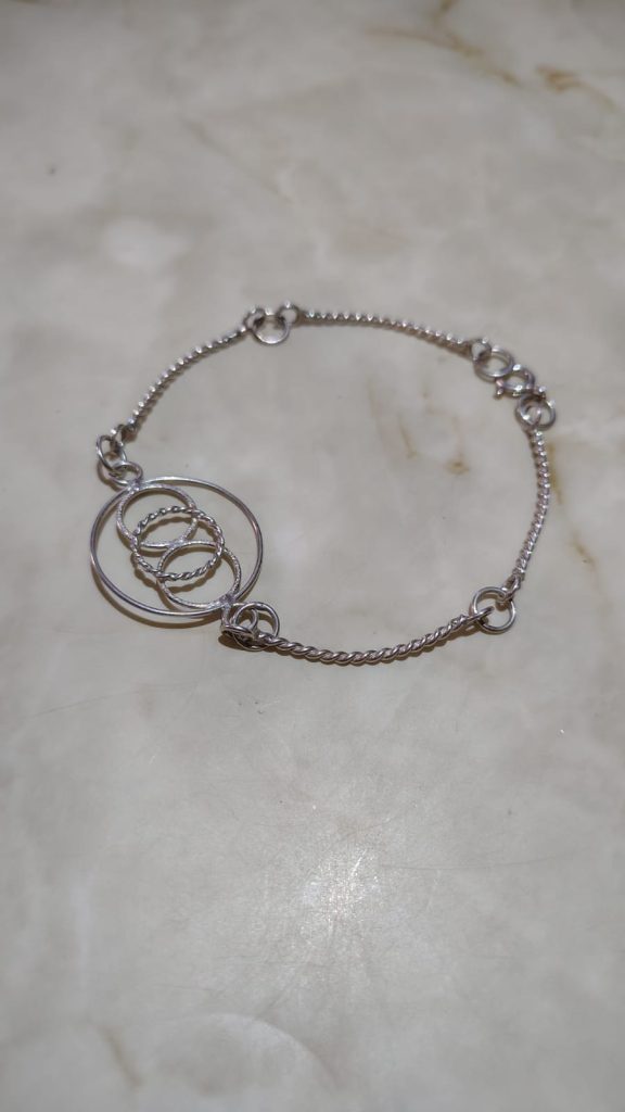 Presenta un motivo central de varios aros o argollas de alambre de plata fino entrelazados, lo que a menudo simboliza el vínculo inquebrantable del amor, la amistad o la familia. Mide 21 cms.