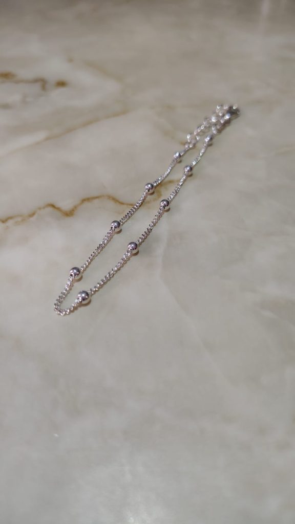 Este diseño se caracteriza por pequeñas esferas o bolitas de plata espaciadas uniformemente a lo largo de una cadena fina Este estilo es versátil, ideal tanto para uso diario como para combinar con otras joyas.