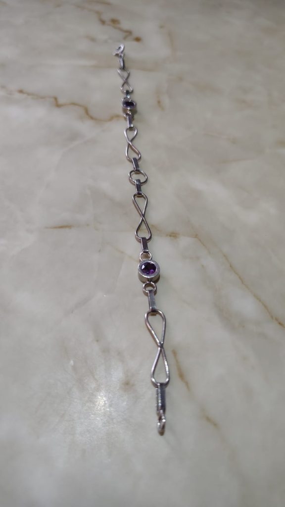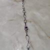 Es un diseño de eslabones de cadena largos y entrelazados, con las piedras engarzadas en puntos específicos de la cadena en circón Amatista. Es un estilo que destaca por ser único y con personalidad. Largo 18 cms.