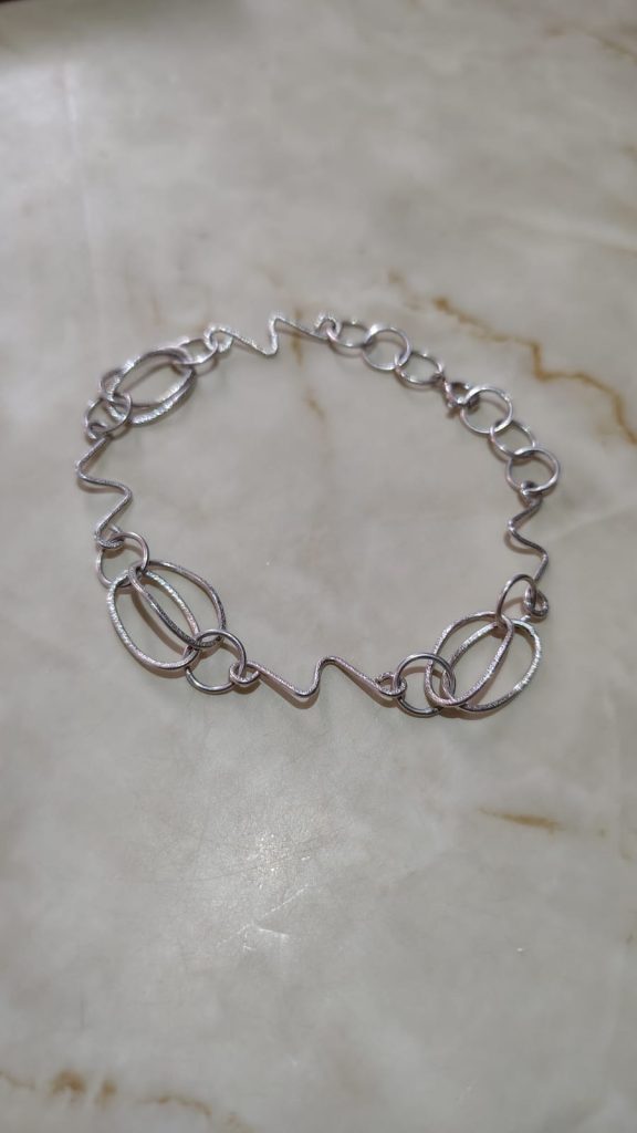 Pulsera de cadena con eslabones irregulares o de diseño artístico, hecha de plata . El diseño presenta eslabones grandes de formas variadas, incluyendo formas ovaladas y secciones de alambre ondulado, lo que le da un aspecto contemporáneo y llamativo. Mide 20 cms.